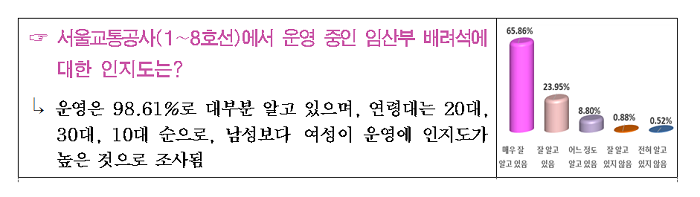 서울특별시의회 교통위원회 추승우 의원은 서울교통공사로부터 ‘임산부 배려석 관련 설문조사 결과’를 분석한 결과 이같이 나타났다고 7월 25일 오전 밝혔다. 서울지하철 임산부 배려석은 국가적 문제인 저출산 해결에 일조하고 임산부를 배려하는 대중교통문화 정착을 위해 2013년부터 운영되고 있다.올해 5월 말 기준으로 지하철 1~8호선 전동차 3,550칸에 총 7,100석이 운영 중이며, 7인 중앙좌석의 양 끝에 2자리가 설치되어 있다. 하지만 운영 취지와는 다르게 지하철을 이용하는 시민들의 사이에 갈등을 유발하는 원인으로 지목 되었다. 실제 지하철 4호선 전동차의 임산부석 7개 칸이 낙서로 훼손되고, 임산부 배려석의 임산부를 폭행한 사건이 일어나 국민청원 게시판에도 올라오는 등 사건·사고가 끊이지 않고 있다. 관련 민원도 폭주하여 지난해 임산부 배려석 관련 민원은 약 2만7천 건에 육박하는 것으로 나타났다. 이에 서울교통공사가 임산부 배려석 불편 민원 해소를 위하여 서울지하철 1∼8호선 이용 시민을 대상으로 임산부석에 대한 인식도, 임산부 및 비임산부 행태, 개선사항 등에 대해 설문조사를 시행했다. 이번 설문조사 응답자는 일반인 4,977명과 임산부 1,202명으로 총 6,179명이다. 설문조사 내용을 살펴보면 임산부 배려석 운영에 대한 인지도 문항에서는 응답자 98.61%가 대부분이 알고 있다고 응답했다. 또한 임산부 배려석 위치 및 디자인 문항에서는 응답자 77%가 임산부 배려석 팔걸이와 좌석 뒤 목베개가 필요하다고 응답했다.