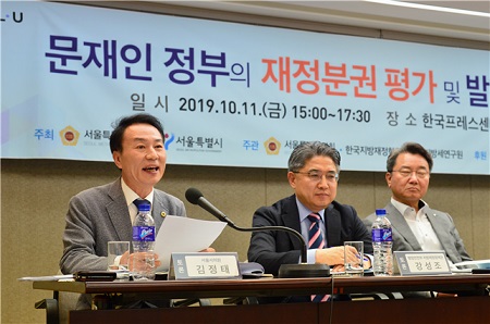 토론회’가 열렸다. 11일(금) 오후 3시 한국프레스센터에서 서울특별시의회와 서울특별시 공동주최, 한국 지방재정학회·한국 지방연구원 주관, 전국 시·도의회 의장협의회·대한민국 시도지사협의회가 후원한 ‘문재인 정부의 재정 분권 평가 및 발전방안 토론회’가 개최됐다. 토론회에는 김정태 전국 시·도의회 의장협의회 지방분권TF 단장(서울시의원, 아래 단장)이 토론자로 참석했다. 김정태 단장은 이날 “지속 가능한 국가 발전의 최고 발전전략으로 지방분권과 국가균형발전을 꼽는 문재인 정부의 강한 실천 의지에 비하면 1년 넘게 계류해 논의의 기회조차 잃은 각종 지방 이양 개정법들과 재정 분권을 위한 소극적인 법 개정 내용” 등을 지적하고 정부의 실질적 실천방법을 제시했다. 김정태 단장은 “총 2단계로 추진하고 있는 재정 분권 정책의 기본방향은 자체 재원주에 기초, 지방 세입 구조 혁신을 통한 지방 스스로 재정 운영 주도와 그 결과에 책임지는 책임 지방재정 틀 구축을 지원하는 것임에도 불구하고 1단계부터 삐걱거리고 있는 실정이다.”라고 말했다. 김 단장은 이어 “지방 소비세율 인상에 따른 지방재정 이양의 1단계 본래 취지와는 달리 결과적으로 국고 보조사업 등의 지방정부 이양 작업으로 인해 실질적 지방재정 확충 결과는 미비하다”라며 “지방 소비세율 10% 인상 금액 8조 7,000억원 중 균특사업 보전분 3조 6,000억원과 재정조정분 9,000억원을 제외하면 잔여분은 4조 2,000억원에 불과하다. 소비세율 10%의 효과는 서울시의 경우 지역 상생발전기금과 시·도별 가중치를 적용하면 실제 순증 규모는 3,000억원에 불과하다.”라고 지적했다. 김 단장은 “서울시의회도 전국 지방의회와 협조를 통해 함께 재정 분권을 위해 더 열심히 노력하겠다. 아직 재정 분권 1단계의 과정이 마무리되지 않았지만, 2단계에는 지방소득세에 집중하며, 다양한 의견들을 반영하여 더 발전시켜 준비하겠다.”라며 향후 구상을 밝혔다. 한편 이날 토론회에는 이호대 서울시 의원을 사회자로 신원철 의장(서울특별시의회)의 개회사와 강태웅 행정1부시장의 축사로 토론회 막을 열었다. 주제발표와 토론발표에서는 윤영진 명예교수(계명대)가 좌장으로 나섰으며, 배민명 교수(서울여대), 유태현 교수(남서울대), 김홍환 연구위원(한국지방세연구원)이 주제발표자로, 김선갑 구청장(광진구), 김정태 단장(서울특별시의회), 정남구 기자(한겨레), 강성조 지방재정정책관(행정안전부), 백일헌 재정기획관(서울시)이 토론자로 참여했다.