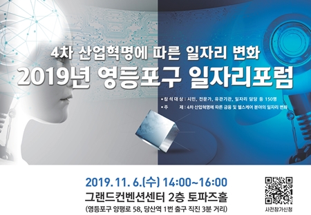 영등포구(구청장 채현일)가 ‘2019 일자리 포럼’을 6일(수) 오후 2시부터 4시까지 그랜드컨벤션센터 토파즈홀에서 개최한다고 4일 밝혔다.