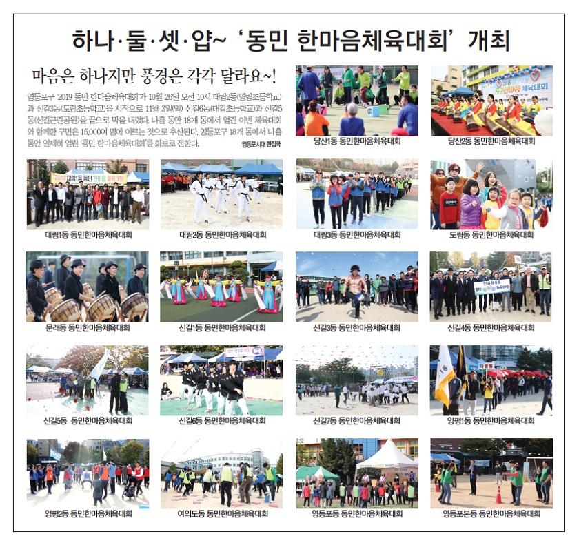 -마음은 하나지만 풍경은 각각 달라요~! 영등포구 ‘2019 동민 한마음체육대회가 10월 26일 오전 10시 대림2동(영림초등학교)과 신길3동(도림초등학교)을 시작으로 11월 3일(일) 신길6동(대길초등학교)과 신길5동(신길근린공원)을 끝으로 막을 내렸다.