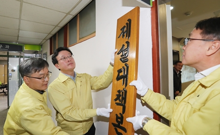 영등포구(구청장 채현일)가 강설예보 상황에 신속히 대비하기 위해 ‘제설대책본부’를 편성하고 14일(목) 구청 5층 방재종합상황실에서 채현일 영등포구청장과 직원 및 관계자 40여 명이 참석한 가운데 현판식을 개최했다.