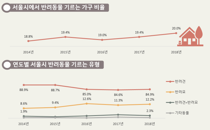서울시 5가구 중 1가구는 ‘반려동물과 사는 것으로 나타났으며 반려동물의 종류는 반려견이 85%를 차지하고 있는 것으로 조사됐다.