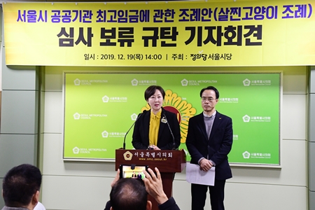 정의당 서울시당은 19일 오후 서울시의회 브리핑룸에서 기자회견을 열고 “‘서울특별시 공공기관 임원 최고임금에 관한 조례안’ 일명 ‘살찐 고양이조례’안 통과를 위해 박원순 서울시장이 직접 나서야 한다”고 촉구했다.