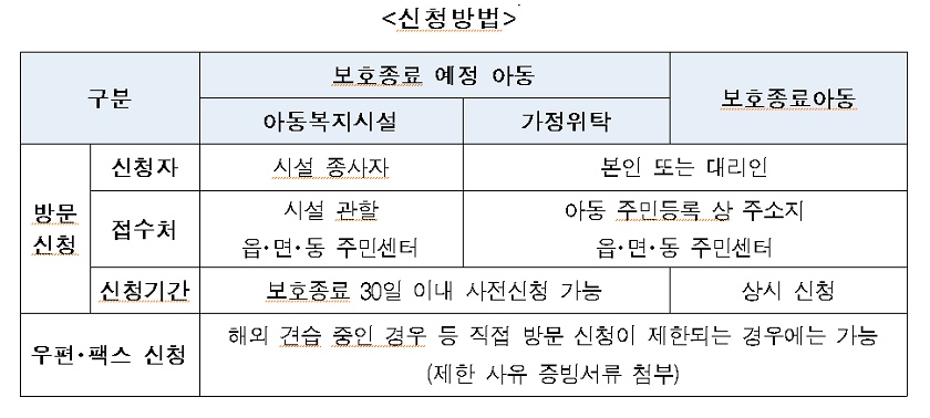 보건복지부는 우선 자립 수당 지급대상을 보호 종료 2년에서 3년 이내 아동으로 확대하고 아동일시보호시설, 아동 보호 치료시설 보호 종료 아동도 포함한다. 자립 수당 및 주거 지원통합서비스 신청은 자립 수당은 보호 종료 아동 본인이나 그 대리인이 아동 주민등록 주소지 읍·면·동 주민센터를 방문하여 신청할 수 있다. 보호 종료 예정 아동의 경우에는 보호 종료 30일 전부터 사전신청이 가능하며, 아동양육시설·공동생활가정 시설종사자가 시설 관할 읍·면·동 주민센터에 신청서를 제출하면 된다. 주거 지원통합서비스는 한국토지주택공사 매입임대주택·전세임대주택 거주 중인 보호 종료 5년 이내 아동이 거주를 원하는 지역의 담당 수행기관에 방문 또는 우편으로 신청해야 한다.