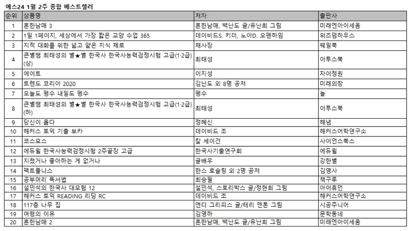 무기력해진 마음에 다시 시작하고 싶은 의욕과 용기를 불러일으켜 주는 글 배우 작가의 <지쳤거나 좋아하는 게 없거나>는 여섯 계단 내려 13위에 자리했다. 2019 예스24 종합 베스트셀러 1위에 등극한 소설가 김영하의 산문 <여행의 이유>는 아홉 계단 하락한 19위다. 이 밖에도 김난도 서울대 교수와 서울대 생활과학연구소 소비트렌드분석센터가 2020년의 기술과 시장 핵심 트렌드를 분석한 <트렌드 코리아 2020>는 한 계단 내려 6위를 차지했고 마음의 문제를 스스로 해결할 수 있도록 돕는 <당신이 옳다>가 9위로 순위에 다시 얼굴을 내밀었다. 현대 천문학을 대표하는 과학자 칼 세이건의 <코스모스>는 tvN 프로그램 ‘요즘 책방’ 1월 방송에 노출된 이후 전주 대비 여덟 계단 올라 11위를 기록했고 명확한 데이터와 통계로 팩트의 중요성을 일깨우는 <팩트풀니스>는 여섯 계단 내린 14위다. 초중등 학부모를 위한 독서교육 지침서 <공부 머리 독서법>은 세 계단 내려 15위를 차지했다. 어린이 학습 만화 <설민석의 한국사 대모험 12> 조선의 발명품 편은 일곱 계단 내려 16위로 안착했고 호주의 아동 작가 앤디 그린피스의 나무집 시리즈 <117층 나무집>이 18위로 다시 순위에 올랐다. 전자책 순위에서는 중국의 역사 소설 ‘초한지’를 우리나라 사람들의 구미에 맞게 변형한 <김팔봉 초한지>가 36년 만에 재출간 되며 1위에 올랐고 186개 회사의 팀장들이 90년생과 협업하고 성과를 이끌 방법을 일러주는 매뉴얼 <90년생과 일하는 방법>이 한 계단 올라 2위를 기록했다.