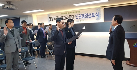 영등포구시설관리공단은 최근 인권에 대한 의식이 사회적으로 관심을 끌고 있는 가운데 10일(금), 2019년 종무식에서 이사장을 비롯한 전 직원이 노사공동 인권경영헌장을 낭독하고 서약식을 개최했다. 이날 낭독한 인권경영헌장에는 인권 행정을 위한 실천 의지와 함께 구민과 직원의 인권침해 사전예방, 고용에 있어 일체의 차별 금지, 모든 협력업체에 인권침해가 발생하지 않도록 한다는 내용이 담겨있다. 김윤기 이사장은 이사말을 통해 “인권경영문화 정착을 위해서는 공단인으로서 자존감을 갖고 시설을 이용하는 손님에게 정성을 다해야 한다”라고 강조하고 “인권경영선포를 계기로 구민의 권익보호는 물론 즐거운 직장, 행복한 일터 조성을 위한 지원과 협력을 아끼지 않을 것이다”며 인권경영문화를 강조했다. 영등포구시설관리공단은 이에 앞서 9일(목) 영등포구에서 주관하는 아동인권교육에 참석하는 등 직원들의 인권의식을 높이기 위해 노력하고 있다.