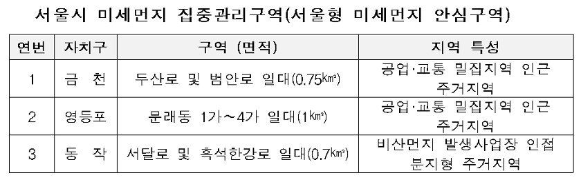 서울시는 영등포•금천•동작 등 미세먼지(PM10) 또는 초미세먼지(PM2.5)의 연간 평균농도가 환경기준을 초과하고 “미세먼지 취약계층 이용시설”이 집중된 지역을 미세먼지 집중관리구역으로 지정했다. 이름은 긍정적인 주민 인식 확산을 위해 ‘서울형 미세먼지 안심 구역’으로 지었다. 미세먼지 집중관리구역 지정 지역은 어린이집, 노인복지시설 등 미세먼지 취약시설 밀집 지역이다. 미세먼지 집중관리구역으로 지정되면 지역 특성에 맞는 미세먼지 저감 사업을 최우선으로 지원하고 배출업체 등에 대한 단속을 강화하고 지역별 특성에 따라 맞춤형으로 미세먼지 저감 및 주민건강 보호를 위한 지원사업을 ‘미세먼지 집중관리구역’에 우선으로 추진한다. 또한, 지자체 주관으로 ’집중관리구역‘에 대한 관리를 위해 취약계층 이용시설 및 오염물질 배출시설 대표자 등과 협의체 운영이 가능하다.