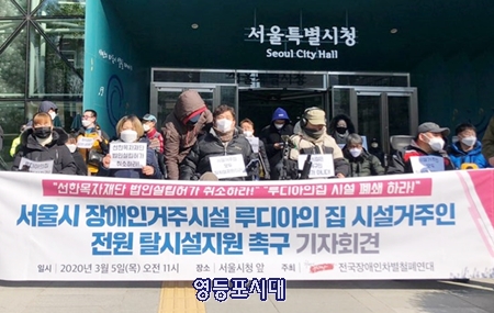 장애인단체는 5일 오전 서울시청 정문 앞에서 기자회견을 열고 “시설 거주 장애인에 대한 폭행·폭언·가혹행위 등 인권침해를 저지른 서울시 장애인 거주 시설 ‘루디아의집’에 대한 법인설립허가 취소와 시설 폐쇄는 너무나 당연한 책무다”며 “시설 폐쇄를 넘어 탈시설 지원해야 한다”고 주장했다. 장애인단체는 “더 이상의 시설범죄를 마주하지 않기 위해 서울시 관할 장애인 거주 시설에 대해 폐쇄 및 변환계획이 속히 마련되어야 한다”며 ▲장애인 인권재난 코로나19 상태인 루디아의 집에서 시설거주인 전원에 대하여 인권재난 대응과 권리보장 차원에서 탈시설 지원계획 즉각 수립 및 이행 ▲피해자 11명에 대하여 3월 이내 탈시설 대책으로 인권보장 이행, 루디아의집 잔류 거주인 54명에 대하여 4월 이내 탈시설 계획 수립 후 협의 진행 ▲시설 거주 장애인에 대한 탈 시설지원 이행과 동시에 서울시는 선한목자재단에 대한 법인설립허가 취소, 관할구는 루디아의집 폐쇄 이행 ▲2019년 협의 사항인 프리웰과 인강재단 산하 236명에 대한 탈시설 약속 이행을 요구했다.