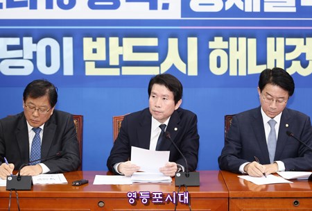 민주당 이인영 원내대표는 10일 오전 국회에서 원내대책회의를 열고 “선거운동보다 방역이 백배, 천배 중요한 상황이다”며 “전국에서 모든 민주 당원이 참여하는 방역 지원 활동에 전면 돌입하겠다”고 밝혔다. 이인영 원내대표는 “지역사회의 소독과 방역 활동을 돕고 마스크 만들기 운동, 그리고 자영업 지원, 소외시설 지원 등 지역주민을 돕는데 당력을 집중하겠다”며 “위기상황에서는 대응 속도가 성패를 가름한다”고 강조했다. 이 원내대표는 “매일 국회의원, 당직자, 보좌진이 참여하는 ‘국난극복위원회 실행 회의’를 열어서 워룸을 운영하듯이 국민의 눈으로 문제를 살피고 하나하나 해결해 나가겠다”며“10개의 핵심과제 ▲마스크 수급 ▲병실 확보, ▲의료진 확보 ▲치료제 개발 ▲신천지 및 다중시설대책, ▲출입국관리 ▲아이 돌봄과 학교대책 ▲자영업과 소상공인대책 ▲피해산업 지원대책 ▲대구·경북 지원 대책” 등을 먼저 해결하는 데 총력을 기울이겠다”고 밝혔다. 이인영 원내대표는 “이어서 경기회복과 민생대책, 안전뉴딜대책 등 후속대책 마련에도 즉시 착수하겠다”며 “국난이 극복될 때까지 10대 핵심과제와 후속 과제 해결을 위해 앞만 보고 전력 질주하겠다”고 강조했다. 조정식 정책위의장은 “코로나19의 확산세가 주춤하고 있다”라면서도 “아직 안심할 단계는 아니며 코로나19의 조기종식을 위해 확산 차단 및 방역 조치 강화에 더욱 바짝 고삐를 조일 때다”고 강조했다. 조 정책위의장은 “산발적인 집단감염을 더욱 효과적으로 차단하기 위해서는 국민들의 협조가 절실하다”며 “불편하시겠지만, 사태가 진정될 때까지 병원 등에 방문을 자제하고 다중·다수 밀집 행사 참석을 가급적 자제해 달라”고 당부했다. 조 정책위의장은 미래통합당을 향해 “국가적 재난 상황이 하루빨리 종식되기 위해서는 정치권이 한목소리를 내는 것이 무엇보다 중요하다. 정쟁과 발목잡기를 멈추고 코로나19 극복에 동참해주길 바란다”며 “사태가 안정세를 보일 때까지 만이라도 정부에 대한 무분별한 공격을 멈추고 협력해줄 것을” 당부했다. 조 정책위의장은 10일부터 본격적으로 시작되는 추경 예산안에 대한 심사와 관련 “신속한 현장 투입의 중요성”을 강조하고 “추경 심사의 최대 관건은 첫째도 속도, 둘째도 속도다. 속도감 있는 추경 처리만이 예산투입 효과를 배가시킬 수 있다”며 “야당의 전폭적인 협조”를 강력히 촉구했다.