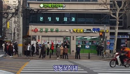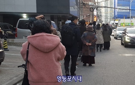 12일 오후 주민들이 영등포구 당산로에 있는 약국 앞에 마스크를 구매하기 위해 길게 줄을 서서 기다리고 있다. 비단 이곳뿐만이 아니라 다른 약국 앞도 상황이 크게 다르지 않다. 정부와 민주당이 연일 “마스크 공급을 늘리기 위해 최선을 다하고 있다”고 밝히고 있지만, 마스크를 구매하지 못한 주민들의 동동거리는 발걸음은 한동안 지속될 것으로 예상된다.
