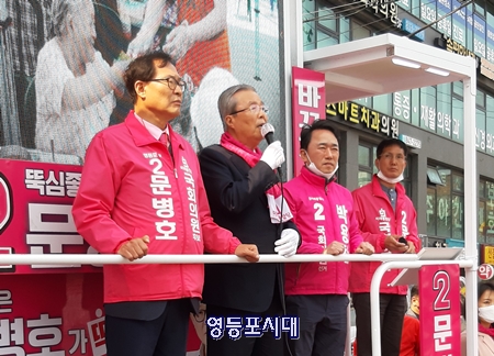 이날 열린 지원 유세에는 김종인 총괄선대위원장과 박용찬, 문병호 영등포갑을 후보가 함께 유세차에 올라 지지를 호소했다. 박용찬 후보는 “영등포의 발전이 없다”라고 주장하고 “이제는 영등포를 변화시킬 수 있는 사람으로 바꾸어 달라”며 “현(문재인) 정부를 갈아치우자는 것이다”라고 목소리를 높였다. 문병호 영등포갑 후보는 김영주, 김민석 후보를 겨냥해 “언제 적 정치인가요”라고 묻고 “이제는 바꿔야 한다”라며 자신들의 지지를 호소했다. 김종인 총괄선대위원장은 “문재인 정부는 법을 지키지 않는다”라며 “숨기는 게 많아서 조국을 내세워 검찰을 흔들었다”라고 주장했다. 김종인 총괄선대위원장은 유세장을 찾은 주민들을 향해 “못 살겠다. 갈아보자”라는 구호를 외치며 자당 후보들의 지지를 호소했다.