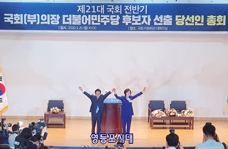 여∙야가 각각 1명씩 나눠 맡는 국회부의장에 후보에는 여당 몫으로 김상희(4선) 의원이 추대돼 헌정사상 첫 여성 국회부의장 탄생을 눈앞에 두었다. 당선인 만장일치로 국회의장 후보로 추대된 박병석 의원은 “일하는 국회”를 강조하고 “일하는 국회 개혁 TF를 즉각 구성하겠다”라고 말했다. 박 의원은 이어 “법정시한 내 21대 국회 개원”을 강조하고 “21대 국회가 새로운 모습을 보이느냐 여부에 시금석이 될 것이다. 좋은 시작이 좋은 결과를 낳는다”라고 밝혔다. 박병석 의원은 “2년 뒤 다시 당으로 돌아올 때 신뢰받는 국회의 초석을 다졌다는 의장이 되길 간절히 기도하겠다”라고 덧붙였다. 김상희 국회부의장 후보는 “여러분께서 저를 최초의 여성 부의장 후보로 결정해주셨다”라며 “민주당은 73년 헌정사에 큰 이정표를 세웠다”라고 감사의 인사를 전했다. 민주당은 이에 앞서 19일부터 20일까지 이틀 동안 후보 접수를 진행한 결과 국회의장 후보에는 박병석 의원, 국회부의장 후보에는 김상희 의원이 각각 단독으로 등록한 바 있다. 21대 국회는 의장단을 선출하는 첫 본회의를 6월 5일까지 치러야 한다. 국회법에 정해진 법정시한이다. 민주당 김태년 원내대표는 이날 “그동안 국회는 개원까지 많은 시간을 소모했다”며 “평균 44일이 걸렸고 어떨 때는 무려 석 달간 국회 문을 열지 못했다”라고 지적했다. 김 원내대표는 “21대 국회는 시작부터 달라야 한다”라며 “21대 국회는 그 어느 때보다 비상하고 엄중한 시기에 시작한다. 이번만큼은 제날짜에 국회를 열어야 한다”라고 강조했다. 김태년 원내대표는 “원 구성 협상을 신속하게 마무리할 수 있도록 최선을 다하겠다”라고 덧붙였다.