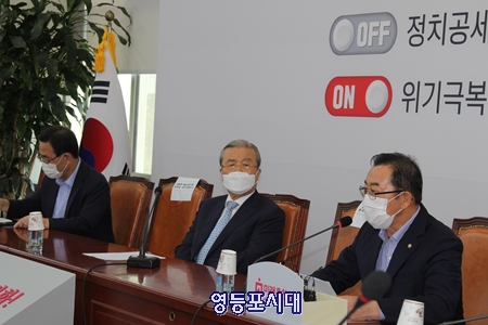 김종인 위원장은 “최근 와서 코로나 사태를 정치화하려는 여권의 행태 등을 보면서 그런 생각을 했다”며 이같이 강조했다. 김 비대위원장은 “정부가 실책을 반복하고 있다”고 주장하고 “코로나가 잠시 소강 상태 보이자 대통령이 마스크 벗고 국무회의에서 마스크 벗어도 된다고 한 적 있다. 정부가 잘못된 메시지 보내 유행이 찾아왔다”고 주장했다. 김종인 비대위원장은 “당시 정부는 모든 책임을 국민에게 돌리며 국민에게 책임을 전가했다”며 “이번에도 여행과 소비를 장려하는 등 방심했고 코로나는 퍼져나갔다”고 거듭 주장했다. 김 비대위원장은 “최근 검찰 파괴 사태와 조국, 울산시장 선거 개입, 윤미향 사건, 권력형 의혹 사건에 대해서는 침묵과 공정과 정의에 어긋나는 모습 보이는 것이 현실이다”며 “민주주의에 어긋나지 않도록 엄중하게 조치해야 한다”고 강조했다. 주호영 원내대표는 “코로나19 2차 대유행 감염이 전문가들 사이에서 경고되었음에도 이를 막지 못한 것은 정부 책임이다”고 직격탄을 날리고 “정부는 사과하고 무엇을 잘못했는지 고백하고 앞으로는 이런 잘못하지 않겠다고 해야 한다” 주 원내대표는 “실제 정부 잘못이 크다”며 “국민에게 경각심 고취하고 계도해야 할 정부가 오히려 여행 장려하고 외식 쿠폰을 발행하면서 잘못된 인식 심어준 점 때문이다”고 비판했다. 주호영 원내대표는 의료협회의 파업에 대해서도 “정부가 의료협회와 대화를 나누지 않아 파업에 돌입해 국민이 어려움이 많다”며 “더 많은 의료인력이 필요하고 헌신해야 될 때 정부의 무대책을 비판하지 않을 수 없다”고 목소리를 높였다. 주 원내대표는 “코로나로 사회적 많은 영향 받고 있는데 미래통합당이 발의한 코로나 민생지원법에 협조하고 민주당은 참여해주길 바란다”고 밝혔다.