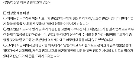 이에 대해 추미애 법무부 장관 아들 서모 씨는 2일 오후 자신의 변호인(정상진, 임호섭)을 통해 입장문을 밝혔다. 변호인은 입장문에서 “서모 씨의 병가 및 휴가와 관련한 고발이 이루어진 뒤 그 내용을 조사한 결과 법적으로 아무런 문제가 없음을 확인했다”라고 밝혔다. 변호인은 “그동안 제기되었던 의혹에 대해 아무런 대응을 하지 않았던 것은 검찰이 신속하게 수사를 진행하면 서모 씨의 무고함이 증명될 것이라 믿었기 때문이다”라며 뒤늦게 사실관계에 관해 설명하는 이유를 밝혔다. 변호인은 황제 휴가 논란에 대해서도 “서모 씨는 병가 규정에 따라 국군 양주병원에서 수술이 필요하다는 진단을 받아 병가를 신청하였고, 병가신청에 필요한 서류 일체를 모두 제출하였다”고 밝혔다. 또한 “2차 병가도 병가신청에 필요한 서류를 삼성서울병원에서 발급받아 제출하였기 때문에 병가와 관련해서 서모 씨가 하여야 할 의무는 모두 다 하였다”라면서도 “그런데도 마치 규정을 어겨가면서 병가를 간 것처럼 주장하는 것은 서모 씨의 명예를 심각하게 훼손하는 것이다”고 일축했다. 변호인은 “상식적으로 보더라도 병가에 대한 결재권자의 명령도 없는데 사병이 병가를 갈 수는 없는 것이다”며 “서모 씨가 삼성서울병원에 확인해본 결과 지난 8월 6일 서모 씨에 대한 의사소견서, 일반진단서를 서울 동부지검에서 발부받아 가져갔다는 사실을 확인했다”고 밝혔다. 변호인은 “수사당국은 근거 없는 의혹 제기로 피해를 보는 사람이 발생하지 않도록 신속한 수사해 주기 바란다”며 이에 대한 신속한 수사를 촉구했다.