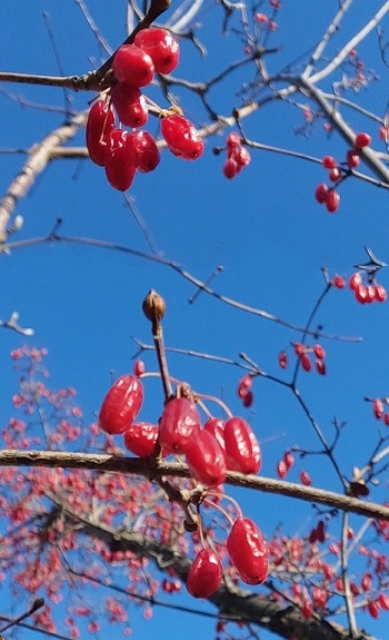 붉은 열매가 빛난다 공원관리소 앞 산수유다. 노란 꽃을 떨구고는 잎새와 같은 녹색 열매였다가 잎새가 옷을 갈아입으며 열매도 붉게 변한다. 사람들은 그 붉은 열매로 술을 담고, 차로 달여 마신다. 열매가 지고나면 물러가는 추위 끝자락에 일찌감치 샛노란 꽃을 피운다 그때가 내년 3월쯤 될 거다.