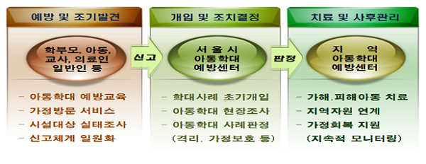 시는 ‘서울시 아동학대예방센터’를 종합 컨트롤타워로, 지역 아동학대예방센터를 사례관리 중심센터로 특화해 운영함으로써 서울지역에서 아동학대로 고통받는 상황을 최소화하도록 체계적으로 관리한다는 계획이다. 즉, 서울시아동학대예방센터가 아동학대 신고접수․초기 개입․현장조사․사례판정 등을 담당하고, 지역의 센터는 가해․피해아동의 치료 및 사후관리를 담당하는 효율적인 역할 분담을 하게 된다. 시는 ‘서울시 아동학대예방센터’를 24일(목) 14시 개관, 아동학대예방 정책에 대한 공적개입을 강화하고, 민간과의 협력을 통해 한 번 아동학대로 신고된 아동은 절대로 재학대가 일어나지 않도록 적극 보호하겠다고 밝혔다. 이번 조치는 지난해 발표한 ‘아동학대예방 종합대책’의 일환으로서 미국, 영국, 대만 등 선진국에서도 아동학대예방 정책에 있어 공적개입이 강화되고 있는 추세다.