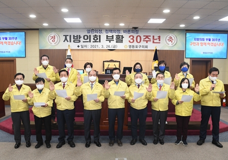 이날 행사는 코로나19로 인해 영등포구의회 의원들과 구의회 사무국 직원들만이 참석한 가운데 영등포구의회의 무궁한 발전을 기원하는 기념 식수(植樹)를 했다. 이어 본회의장으로 이동, 유승용 운영위원장의 선창으로 지방자치 부활 30주년 기념 결의문을 의원들이 낭독한 후, 애국심을 북돋우는 독도 현수막 앞에서 기념촬영을 진행했다. 결의문에는 “영등포구의회 의원들은 지방의회의 위상과 독립성을 강화하고 견제와 균형의 원리를 구현하며, 진정한 풀뿌리 민주주의인 지방자치를 실현해 나가기 위한” 내용을 담아 풀뿌리 민주주의인 지방자치 실현에 대한 강한 의지를 나타냈다. 고기판 의장은 “3월 26일은 1991년 3월 26일 풀뿌리 민주주의의 근간이라고 할 수 있는 지방자치가 부활한 지 30주년이 되는 날이다”며 “기초의회가 처음 시작됐을 때, 성공적인 의회에 대해 우려가 있었지만, 지난 1대 의원에서 지금의 8대 의원까지 끊임없는 노력과 봉사 정신으로 성공적인 기초의회로 자리매김할 수 있게 되었다”라고 밝혔다. 고 의장은 이어 ““앞으로도 영등포구의회는 열린 의정, 정책 의정, 바른 의정을 실현하여, 영등포구의회가 구민들에게 사랑받는 의회가 되도록 최선을 다하겠다.”라고 강조했다. 1961년 5월 16일 군사 쿠데타 이후 30여 년간 중단되었던 지방의회는 1991년 개정된 지방자치법에 따라 시•군•구의회 의원선거(3월 26일)와 시•도의회 의원 선거(6월 20일)가 실시됐다. 올해로 부활 30주년을 맞는 지방자치는 지난 12월, 지방자치법이 전면 개정되면서 지방의회 사무직원의 인사권을 의장이 가지게 되고, 정책 지원 인력을 둘 수 있게 되는 등 지방의회의 독립성과 권한이 강화됐다.