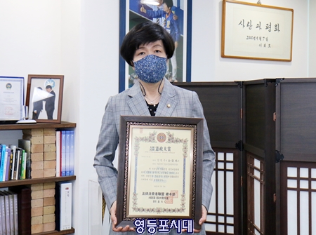법률소비자연맹이 선정한 21대 국회 1차연도 헌정 대상을 수상한 김영주 국회의원의 소감이다. 김영주 의원은 외교통일위원회로 활동하며 정부의 외교·통일 정책이 올바른 방향으로 나아갈 수 있게 합리적이고 근본적인 대안을 제시해 왔으며, 사회적 약자 보호, 국민 안전, 민생 개선 등을 위한 다양한 입법 활동도 펼쳐왔다는 평가를 받고 있다. 김영주 의원이 이번에 수상한 헌정 대상은 270여 시민·사회 단체로 구성된 ‘국정감사 NGO 모니터단’의 주관 단체인 법률소비자연맹이 ▲국회 의정활동 ▲본회의 및 상임위 출석률 ▲법안 발의 성적 ▲국정감사 성적 ▲대정부 질문 가점 등 12개 분야를 계량화하고 종합 평가해 의정활동이 우수한 국회의원에게 수여하는 상이다. 김영주 의원은 “‘일하는 국회를 만드는 데 앞장서겠다’라는 약속을 지키기 위해 열심히 뛰었다”라며 “늘 지금처럼 초심을 잃지 않고 국민 여러분과 영등포주민 여러분을 위한 의정활동으로 보답하겠다”라고 수상 소감을 밝혔다. 법률소비자연맹은 코로나19로 인해 별도의 시상식을 개최하지 않고 의원실로 전달했다.