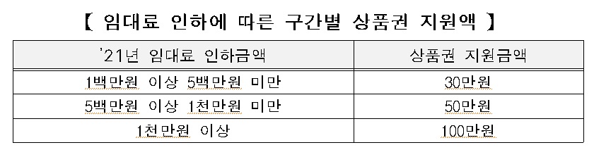 서울시가 코로나19로 어려움을 겪고 있는 임차상인에게 임대료를 자발적으로 깎아준 ‘서울형 착한 임대인’을 선정해 현금처럼 쓸 수 있는 서울사랑상품권을 최대 100만원까지 지원한다고 7월 19일 오전 밝혔다. 지원 대상은 올해 1월부터 12월까지 임대료를 인하했거나 인하할 예정이면서 상가임대차법을 적용받는 서울 소재 환산보증금 9억원 이하 상가 임대인이다. 임대인과 임차인이 상가임대료 인하 ‘상생협약’을 체결하면 신청대상이 된다. 상품권(모바일상품권)은 임대료 인하 총금액(’21년)에 따라 30만원(1백만원 이상~5백만원 미만), 50만원(5백만원 이상~1천만원 미만), 100만원(1천만원 이상)을 지원한다. 9월 중 지급대상을 확정해 10월 초까지 임대인에게 지급할 예정이다. 임대인 한명이 여러 임차인과 상생협약을 체결했다면 인하한 임대료 총금액에 따라 상품권 지급 금액이 정해진다.