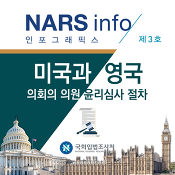 국회입법조사처는 8월 4일 ‘미국과 영국 하원의 의원윤리 심사현황’을 분석·정리하여 미국과 영국 의회의 의원윤리 심사 절차를 흐름에 따라 한눈에 볼 수 있도록 ‘NARS info’ 제3호 ‘미국과 영국 의회의 의원윤리심사 절차’를 발행했다.