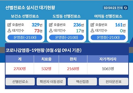 정부의 이 같은 방침에 따라 수도권에서는 당분간 더 오후 6시 이후로는 3인 이상 사적 모임 이 금지(2명까지) 되고 유흥시설의 집합금지 조치 역시 계속된다. 비수도권은 5인 이상 모임 금지와 다중이용시설 영업시간 오후 10시까지 제한 조치도 유지된다. 국내 신종 코로나바이러스 감염증(코로나19) 4차 대유행의 확산세가 좀처럼 꺾이지 않는 가운데 6일 신규 확진자 수는 1천700명대 초반을 나타냈다. 중앙방역대책본부는 이날 0시 기준으로 신규 확진자가 1천704명 늘어 누적 20만7천406명이라고 밝혔다. 전날(1천776명)보다 72명이 줄었으나 사흘 연속 1천700명대를 기록했다. 하루 확진자는 지난달 7일(1천212명)부터 벌써 31일 연속 네 자릿수를 이어가면서 장기화하고 있다. 한편 영등포구 코로나19 현황을 살펴보면 총 2,700명 중 2,168명이 완치 판정을 받았으며 532명이 현재 치료 중이다. 자가격리자는 1,065명이다. (8월 6일 09시 기준) 선별진료소별 실시간 대기 현황은, 보건소 선별진료소 호출 번호 329번 대기인수 73명, 도림동 선별진료소 호출 번호 236번 대기인 수 17명, 여의동 선별진료소 호출 번호 161번 대기인 수는 0명이다.(10시 54분 21초 현재)