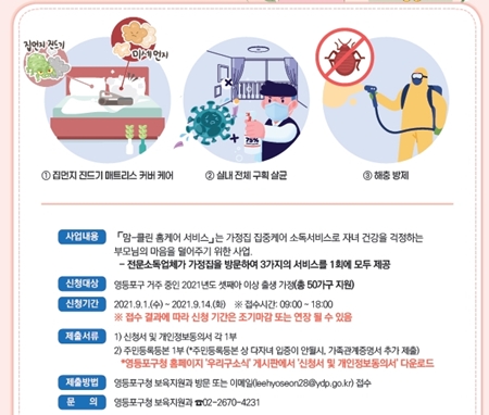 올해 처음으로 총 50가구를 소독해주는 ‘맘-클린 홈케어 서비스’ 사업을 시범 운영할 예정인 이번 사업은 출산장려 분위기를 확산하기 위해 시행된다. 시행은 전문 소독업체가 올해 세 자녀 이상 출산한 가정집을 방문하여, 가구, 집기 등 공간 전체에 대한 철저한 소독과 방역을 한다. 9월 1일부터 14일까지 신청 가구를 모집하며, 접수 결과에 따라 신청이 조기 마감되거나 또는 연장될 수 있다. 영등포구에 거주하며, 2021년도 셋째 애 이상 출생 가구인 경우 신청할 수 있으며, 주민등록등본과 함께 구 홈페이지 ‘우리구 소식’ 게시판에서 신청서와 개인정보 동의서를 다운 받아 영등포구청 보육지원과로 방문하거나 담당자 이메일(leehyoseon28@ydp.go.kr)을 통해 제출하면 된다. 선정된 가구에는 전문 소독업체가 가택을 직접 방문하여 ▲집먼지진드기 매트리스 커버 케어, ▲실내 전체 구획 살균, ▲해충 방제 서비스를 한다. 3가지 서비스를 1회에 모두 제공하며, 소독비는 전액 무료다. 기타 자세한 사항은 영등포구 홈페이지를 참고하거나 보육지원과( 2670-4231)로 문의하면 된다.