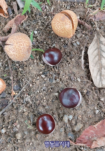 마로니에 칠엽수는 벌써 열매가 영글었다. 지지난밤 거친 비바람에 못 버틴 열매가 수북한데 언뜻 보면 밤이다. 섣부른 사람들은 주워 먹어 탈도 난다는데 너도밤나무라는 이유를 알겠다.