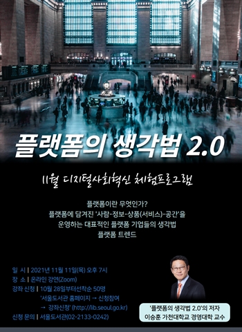 서울도서관은 11월 11일(목) 오후 7시에 ‘플랫폼의 생각법 2.0’을 주제로 저자인 이승훈 교수를 초빙하여 온라인 강연을 개최한다. 세계 10대 기업 중 7개 기업이 플랫폼 기업(2021년 10월 기준, Largest Companies by Market Cap)이 차지하고 있는 플랫폼 비즈니스 시대가 펼쳐지고 있다. 플랫폼은 오프라인의 기차역 등의 승차장에 포함되는 각종 교통수단과 승객들, 편의시설 등인데 온라인 기반으로 그대로 재현되어 다양한 공급자-수요자, 생산자-소비자 등을 연결·공유하는 양면 시장을 형성한다. 서울도서관에서는 ‘플랫폼의 생각법 2.0’ 저자인 이승훈 교수를 초빙하여 플랫폼이 무엇이며, 왜 이해해야 하며, 플랫폼 기업의 운영방식 등을 살펴본다. 플랫폼에 담긴 사람-정보-상품(서비스)-공간을 중심으로 다양한 가치를 창출·연결해가는 대표적인 플랫폼 기업, 즉 사람(소통) 중심의 페이스북, 정보 중심의 구글, 상품 중심의 애플과 아마존 등을 사례로 제시하며, 플랫폼 기업의 생각법을 함께 논의하는 시간이 될 것으로 기대한다. 또 네이버, 카카오, 쿠팡 등 한국의 주요 플랫폼과 당근마켓, 오늘의 집 등 새롭게 떠오르는 플랫폼 흐름에 관한 이야기도 펼쳐진다. 이정수 서울도서관장은 “플랫폼 기업이 세계적으로 급부상하고 가치를 창출하는 것은 플랫폼안의 세상이 우리 시대의 사회경제 및 사람의 요구를 반영하고 필요를 연결해 주기 때문이다”라고 밝혔다. 이 관장은 “플랫폼 기업의 생각법을 통해서 우리 사회와 우리 시민의 필요를 다시 생각해보고 배울 수 있는 시간이 될 것으로 기대한다. 특히, 플랫폼 창업을 준비하는 시민들에게 실제적인 도움이 될 것이다”라고 전했다. 강좌 수강 신청은 10월 20일(수)부터 ‘서울도서관 홈페이지→ 신청·참여→ 강좌 신청’에서 할 수 있다.(https://lib.seoul.go.kr) 시민 누구나 무료로 참여할 수 있으며, 선착순 50명을 모집한다. 강좌에 대한 문의 사항은 서울도서관(02-2133-0242)으로 연락하면 된다.