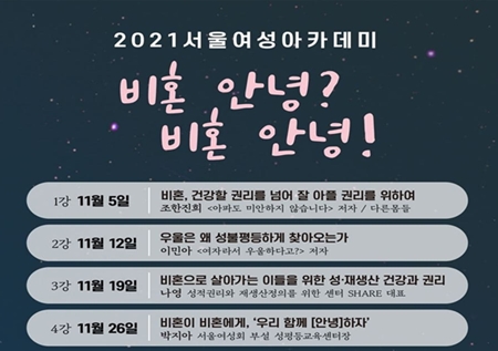 서울여성회가 2021 서울여성 아카데미 ‘비혼 안녕? 비혼 안녕!’을 11월 매주 금요일 19시 30분부터 22시 30분까지 진행한다.