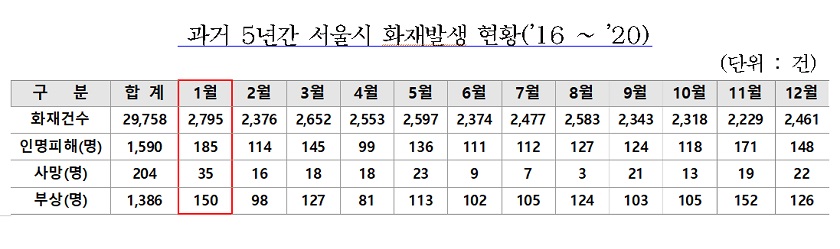 연중 1월에 교통사고‧동파 피해‧고드름 안전조치 관련 출동 최다 발생 서울시 소방재난본부에 따르면 1월에 발생한 화재는 2,795건으로 화재로 인한 사망자는 35명으로 나타났다. 1월은 연중 가장 많은 화재가 발생한 달이었고 인명피해도 사망자를 포함하여 185명으로 가장 많았던 것으로 나타났다.