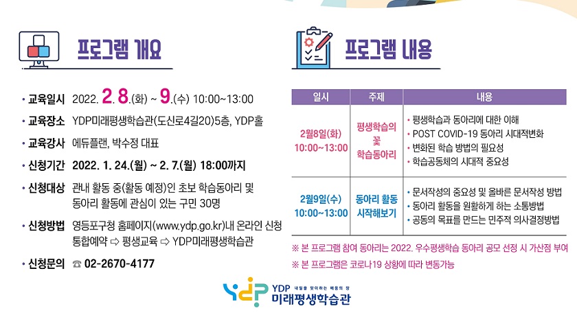 YDP미래평생학습관에서 2월 8일과 9일 이틀간 10시부터 13시까지 진행될 예정인 이번 교육은 8일, ‘평생학습의 꽃 학습동아리’를 주제로 ▲평생학습과 동아리에 대한 이해 ▲변화된 학습 방법의 필요성 ▲학습공동체의 시대적 중요성에 관한 내용으로 진행된다.