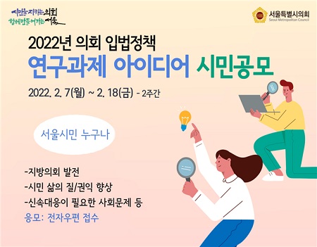 서울시의회가 시민의 의정참여를 확대하고 시민과 밀접하고 다양한 주제를 발굴하여 시민권익 및 삶의 질을 제고하여 신속한 사회문제 해결 방안을 모색하기 위해 2022년도 ‘의회 입법정책 연구용역’의 연구과제 아이디어 시민 공모를 추진한다.
