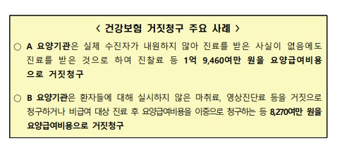 건강보험 요양급여 비용을 거짓으로 청구한 요양기관은 22개 기관으로 의원 11개소, 치과의원 3개소, 한의원 7개소, 한방병원 1개소로 나타났다.