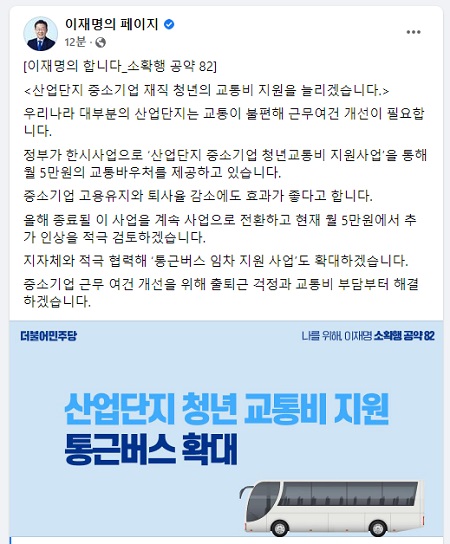 이재명 민주당 대선 후보는 2월 28일 오전 자신의 페이스북을 통해 “이재명의 합니다_소확행 공약 82”번째로 “산업단지 중소기업 재직 청년의 교통비 지원을 늘리겠다”라고 약속했다.