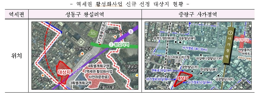 서울시가 역세권 중심 공간구조를 실현하고 주택공급 확대 및 균형발전 도모를 위해 올해 첫 역세권 활성화 사업 신규 대상지로 중랑구 사가정역과 성동구 왕십리역 주변 등 2개소를 선정했다. 이번에 선정된 신규 사업지는 중랑구 사가정역, 성동구 왕십리역 일대다. 두 지역은 면목지구 중심, 왕십리 광역중심에 위치한 곳으로 중심성 강화를 위한 역세권 활성화가 필요한 지역이다.