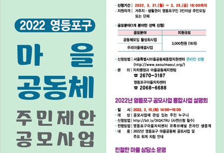 영등포구가 ‘2022년 영등포구 마을공동체’의 주민 제안사업을 공모한다.
