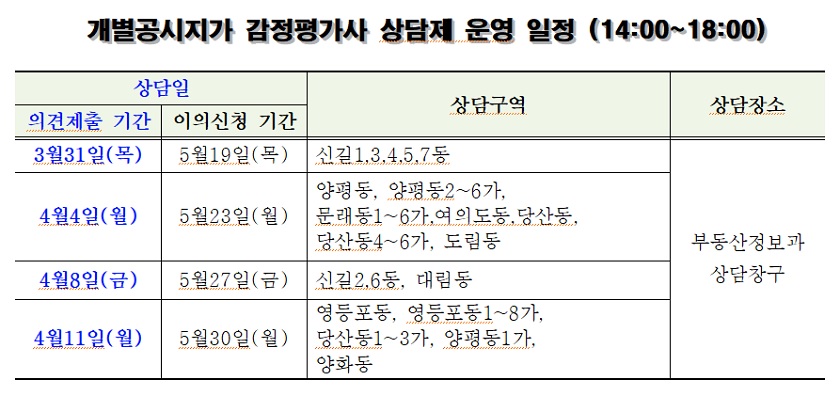 한편 구는, 열람 기간 중 공시지가와 관련한 궁금한 사항을 전문 감정평가사와 직접 상담할 수 있는 ‘개별공시지가 감정평가사 상담제’를 운영한다. 동별 일정이 상이하므로 희망하는 상담 일시와 구역을 부동산정보과 지가조사팀(2670-3744~46, -3737)에 문의해 사전 예약해야 한다.