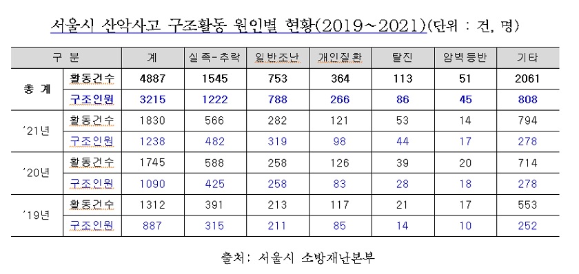 서울시 소방재난본부 자료에 따르면 지난해 구조활동은 1,830건으로 2020년에 비해 85건(4.9%)이 증가했다. 이는 코로나19 확산 전인 2019년과 비교하면 518건(39.5%)이 증가한 것이다. 서울시 소방재난본부는 봄철을 맞이하여 산을 찾는 시민이 증가할 것으로 예상하고 시민 안전 확보를 위해 ‘봄철 산악사고 인명구조 대책’을 추진한다고 25일 밝혔다. 2021년 산악사고 구조인원은 1,238명으로 2019년 887명, 2020년 1,090명과 비교하면 각각 351명(39.6%), 148명(13.6%)이 증가했다. 사고 원인별로는 실족·추락이 1,545건으로 가장 많았고 이어서 조난 753건, 개인 질환 364건 등의 순이다. 장소별로는 북한산이 1,192건으로 가장 많았고 관악산 711건, 도봉산 466건, 수락산 204건 등의 순으로 나타났다. 북한산 등 4개 산에서 있었던 구조활동이 52.6%로 전체의 과반을 넘게 차지했다. 요일별 구조인원은 일요일이 944명으로 가장 많았고, 토요일 805명, 수요일 332명 등의 순이었다. 구조인원의 54%는 주말에 발생한 사고로 구조됐다. 연령대별로 50대가 844명으로 가장 많고 60대가 640명, 20대가 468명, 40대가 380명, 70대가 304명 등의 순이다. 한편 시 소방재난본부는 증가하고 있는 산악사고 추이를 고려하여 등산객들의 안전한 산행을 위한 ‘봄철 산악사고 인명구조 대책’을 4월 1일부터 추진한다. 이번 대책의 주요 추진사항은 ▲드론 등을 활용한 신속한 대응체계 가동 ▲산악 응급구조함・긴급구조 다목적 위치표지판 점검 및 정비 ▲낙석사고 및 고립사고 대비 산악구조훈련 ▲봄철 산행 및 트래킹 안전 캠페인 실시 등이다.