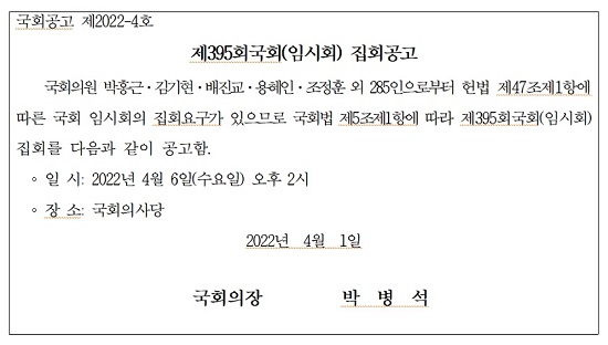 국회는 제395회국회(임시회)를 2022년 4월 6일(수) 오후 2시에 국회의사당에서 집회한다고 4월 1일 오후 공고했다.