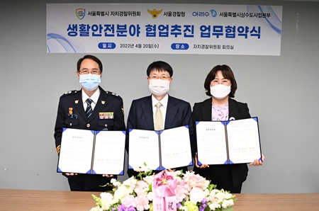 서울시 자치경찰위원회가 서울경찰청, 상수도사업본부와 서울시민 생활안전 분야의 상호협력을 위한 업무협약(MOU)을 20일(수) 체결하고 본격적인 협력에 나섰다. 이번 협약은 자치경찰제 시행에 따른 ‘지방행정’과 ‘치안행정’ 연계사업 발굴의 일환으로 추진되었다. 자치경찰위원회와 상수도사업본부 간 상호 협업과제를 발굴한 결과 ▲재개발·재건축 구역 내 시설물 합동점검 ▲상수도 현장인력을 활용한 치안 서비스 개선 활동 ▲생산시설 보안 합동점검 강화 ▲경찰서·파출소 등의 아리수품질확인제 확대 등을 추진하기로 합의했다. 상수도사업본부에서 재개발·재건축 구역 내 상수도 시설물 점검 시, 자치경찰(서울경찰청 소속)이 동행하여 지역 치안을 점검할 계획이다. 올해부터 관리처분 인가를 받은 49개 구역에 대해 상수도사업소는 상수도 시설을, 자치경찰은 불법침입·범죄예방 관련 점검을 함께 추진하기로 했다. 이와 함께 국가중요시설인 정수센터·취수장 등 수돗물 생산시설의 방호를 위해 자치경찰과 상수도사업본부 직원이 합동순찰을 실시하고 그 결과를 토대로 개선회의를 개최하여 시설물 안전확보에 나설 계획이다. 또한, 상수도사업본부는 수질검사원, 누수탐지원, 배수관 물세척요원 등 시내 곳곳에서 활동하는 현장인력 212명과 함께 치안요소 발굴에 참여한다. 이들이 현장 업무 수행 시 각종 범죄위험을 발견할 경우, 위험상황을 경찰에 통보하는 등 시민의 안전을 위해 자치경찰과 협력체계를 구축할 예정이다. 아울러 시민들이 자주 찾는 경찰서 31개소, 지구대 등 258개소 등 총 289개소를 대상으로 무료 수질검사인 ‘아리수 품질확인제’를 1년에 한 번씩 실시하여 수질 상태를 확인하고 아리수의 우수성도 함께 홍보한다. 업무협약을 맺은 3개 기관은 5월부터 본격적으로 협업과제 실행에 나선다. 12월에는 그간의 추진사항을 점검하고 새로운 협력방안에 대해서도 논의할 예정이다. 김학배 서울시 자치경찰위원장은 “지방행정과 치안행정의 연계를 통해 자치경찰제의 가장 큰 역할인 주민 맞춤형 치안서비스를 제공할 수 있는 사례로 평가될 것”이라고 말했다. 또한, 구아미 서울시 상수도사업본부장은 “이번 협업은 시민 생활안전 분야의 재해예방을 위해 3개 기관이 뜻을 모아 추진되었다”며 “각 기관 간 상호협력을 통해 상승효과를 내는 선례가 될 수 있도록 노력하겠다”고 말했다.