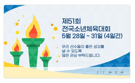 대한체육회는 제51회 전국소년체육대회을 5월 28일부터 5월 31일까지 구민시(경상북도 일원)에서 개최한다. 17개 시도 대표들이 참가하며 경기종목은 초등학교부 21종목, 중학교부 35종목에서 우승자를 가리며 참가 선수는 35개 종목에서 우승자를 가린다.