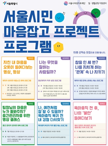 서울시는 서울시민의 일·생활 균형과 일상 회복을 돕는 심리지원 프로젝트 ‘마음잡고(Job Go)’를 6월부터 10월까지 시행한다고 밝혔다. 특히 청년 재직자, 중간관리자, 예비양육자, 육아휴직 복귀자, 보육교사 등을 대상으로 ‘마음 회복’과 ‘성장지원’ 프로그램을 제공할 예정이다. ‘마음잡고 프로젝트’ 참여를 원하는 시민은 누리집(www.mindjobgo.com)을 방문해 ‘마음 진단’ 후 ‘마음 회복·성장지원 프로그램’에 참여하면 된다. 먼저 마음 진단은 ‘직무 스트레스 수준’과 ‘일‧생활 균형 수준’을 진단할 수 있다. ‘마음 진단’ 결과를 토대로 참여자는 마음 돌봄 온라인 콘텐츠를 활용하거나 마음 회복·성장지원 프로그램 등에 참여할 수 있다. 김선순 서울시 여성가족정책실장은 “이번 프로젝트는 서울시민이 직장생활과 일상생활에서 발생하는 스트레스를 극복할 수 있도록 마련되었다”라면서 “혼자 해볼 수 있는 간단한 명상부터 마음속 깊은 고민을 털어놓을 수 있는 맞춤 상담은 물론 온·오프라인 치유 등 다양한 프로그램들이 운영될 예정이라며 많은 시민이 참여하기를 바란다”고 전했다.