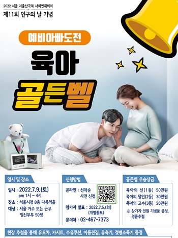 2016년 제4회 인구의 날 기념식부터 진행한 ‘예비 아빠 도전 육아 골든벨’이 3년 만에 대면 행사로 개최된다. 2020년과 2021년에는 코로나19로 인해 온라인으로 개최됐다. 서울시는 7월 9일 서울시청 8층 다목적홀에서 인구보건복지협회 서울지회와 제11회 인구의 날을 기념해 ‘예비 아빠 도전 육아 골든벨’ 행사를 개최한다. 이번 행사는 올바른 육아 상식과 서울시 출산‧육아 지원 정책들을 재미있는 퀴즈 형식으로 풀며 자연스럽게 알게 될 것으로 기대된다. 특히 이를 통해 기존의 잘못된 육아 상식을 바로잡고 다양한 육아 정책을 알 수 있을 것으로 기대된다. 또한, 제11회 인구의 날(7월 11일)을 기념해 육아 골든벨 행사 외에도 ‘함께하면 든든 육아’를 다짐하는 세레머니, 임신을 축하하는 공연으로 출산 전 추억을 만들 수 있는 신나는 축제의 장으로 꾸며진다. 참가자 모두에게 푸짐한 선물과 다양한 경품 추첨의 기회가 제공되며, 수상자는 각각 상금 50만원, 30만원, 20만원을 받는다. 온라인(네이버 카페 ‘맘맘맘 서울’)을 통해 선착순으로 50명을 사전 신청받으며, 7월 4일(월)까지 참여자를 모집한다. 기타 자세한 사항은 070-4947-0453(인구보건복지협회) 번호로 문의하면 안내받을 수 있다. 김선순 서울시 여성가족정책실장은 “도전 예비 아빠 육아 골든벨을 통해 출산 전 재미있는 추억도 만들고, 육아는 부부가 함께하는 것이라는 공감대도 형성하는 시간이 되길 바란다”라고 밝혔다. 김 실장은 이어 “서울시는 앞으로도 저 출생을 극복하기 위해 일․생활 균형 문화를 확산하는 등 시민들이 체감할 수 있는 정책적 노력을 지속해 나가겠다”라고 덧붙였다.