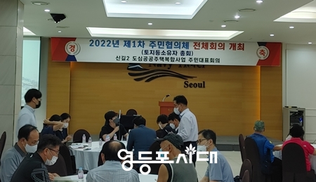 신길2 도심 공공주택복합사업 주민대표(김명희)는 7월 6일 해군호텔 W웨딩홀에서 토지 등 소유자들이 참석한 가운데 전국 최초로 ‘2022년 제1차 주민협의체 전체 회의’를 개최했다.