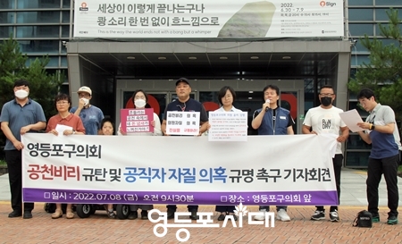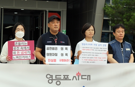 영등포 지역 시민사회·진보정당은 7월 8일 영등포구의회 앞에서 기자회견을 열고 영등포구의회와 영등포경찰서를 향해 “영등포 구의원들의 공천비리 의혹 및 구의원 당선인들의 공직자 자질 관련 의혹에 대한 진상을 명명백백하게 밝힐 것”을 촉구했다.