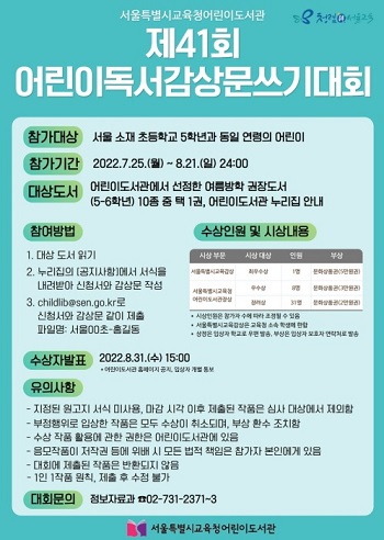 서울시교육청 어린이도서관(관장 이미정)은 7월 25일부터 8월 21일까지 ‘제41회 어린이 독서감상문쓰기 대회’(아래 대회)를 비대면으로 개최한다.
