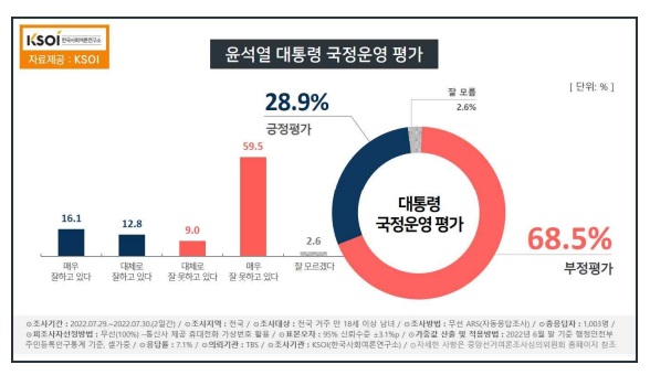TBS-KSOI 7월 29~30일 공동 조사 결과 이같이 나타났다. 지난 2주간 32%대에서 보합세를 보였던 윤석열 대통령의 긍정 평가는 3.3%p 하락해 28.9%로 떨어졌다. 지속해서 늘던 부정 평가는 직전 주보다 4.0%p 증가해 최고치인 68.5%를 기록했다. 정당 지지율은 더불어민주당 43.5%(1.6%p↑), 국민의힘 33.8%(1.7%p↑)로 민주당이 2주 연속 오차범위 밖에서 앞섰다. 윤석열 대통령의 “내부 총질이나 하던 당 대표” 문자 메시지 공개와 관련, 이준석 대표 징계에 대통령의 의중도 작용한 게 아니냐는 주장에 대해서 전체 응답자의 68.8%가 ‘공감한다’라고 답했다. (‘비공감’ 25.5%, ‘잘 모름’5.7%)