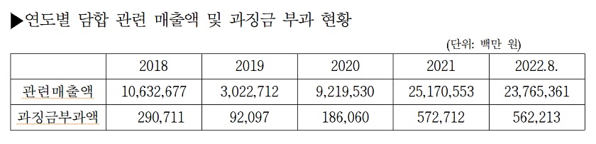 김회재 의원 “윤석열 정부, 담합 기업 제재까지 풀어주려고 하고 있다” 2018년부터 2022년 8월까지 최근 5년간 기업들이 담합으로 올린 매출액이 71초 8천여억 원에 달했지만, 과징금 부과액은 1조 7천여억 원으로 매출액 대비 단 2.4%에 불과한 것으로 나타났다.