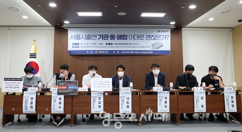 서울시의회는 9월 13일 오후 서울시의회 제2 대회의실에서 ‘서울시 출연기관 통폐합 이대로 괜찮은가?’를 주제로 토론회를 개최했다. 서울시의회 민주당 민생정책위원회와 공공운수노조 서울본부, 공공운수노조공공기관사업팀, 공공운수노조 서울시출연기관지부가 공동으로 주관한 이날 토론회는 서울시의 공공기관 통폐합 논란과 문제점을 점검하고 시민·시민사회·전문가·관계기관 종사자 등 다양한 구성원들의 의견 수렴을 통해 서울시 공공기관의 발전 방향을 모색하기 위해 개최됐다. 서울시의회 이민옥 의원의 사회로 진행된 토론회에서는 조요한 서울기술연구원 지회장이 서울시의 출연기관 통폐합 무엇이, 왜 문제인가?에 대해 먼저 발제하였고, 정재수 서울시 50플러스재단 지회장과 한준희 서울특별시공공보건의료재단 노조위원장도 재단의 입장에서 바라본 통폐합의 문제점에 대해 발제했다.