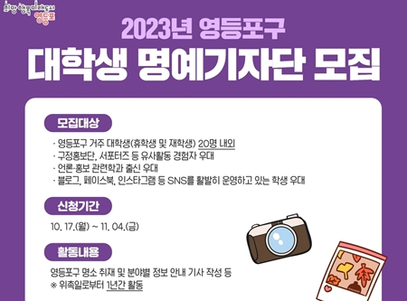 영등포구가 직접 쓴 글로 동네 소식을 알릴 대학생 명예기자단을 모집한다.